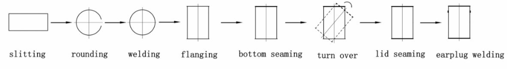 Technical flow:cutting the tin sheet to blank-rounding-welding-outer coating-flanging-bottom lid feeding-seaming-turning over-top lid feeding-seaming-+ear lug welding-leak testing-packaging