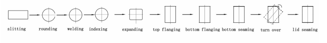 The can making production line is suitable for the semi-automatic production of 130-50L conical pail, which is composed of three metal plates: can body, can cover and can bottom. The can is conical. Technical flow:cutting the tin sheet to blank-rounding-welding-manual coating-conical expanding-flanging&pre-curling-curling&beading-bottom seaming-ear lug welding-manual handle assembly-packaging